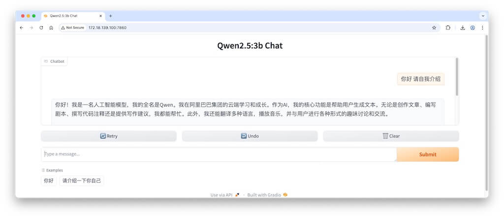 127.0.0.1:7860或localhost:7860。在 Web 界面中和 Qwen 交流。