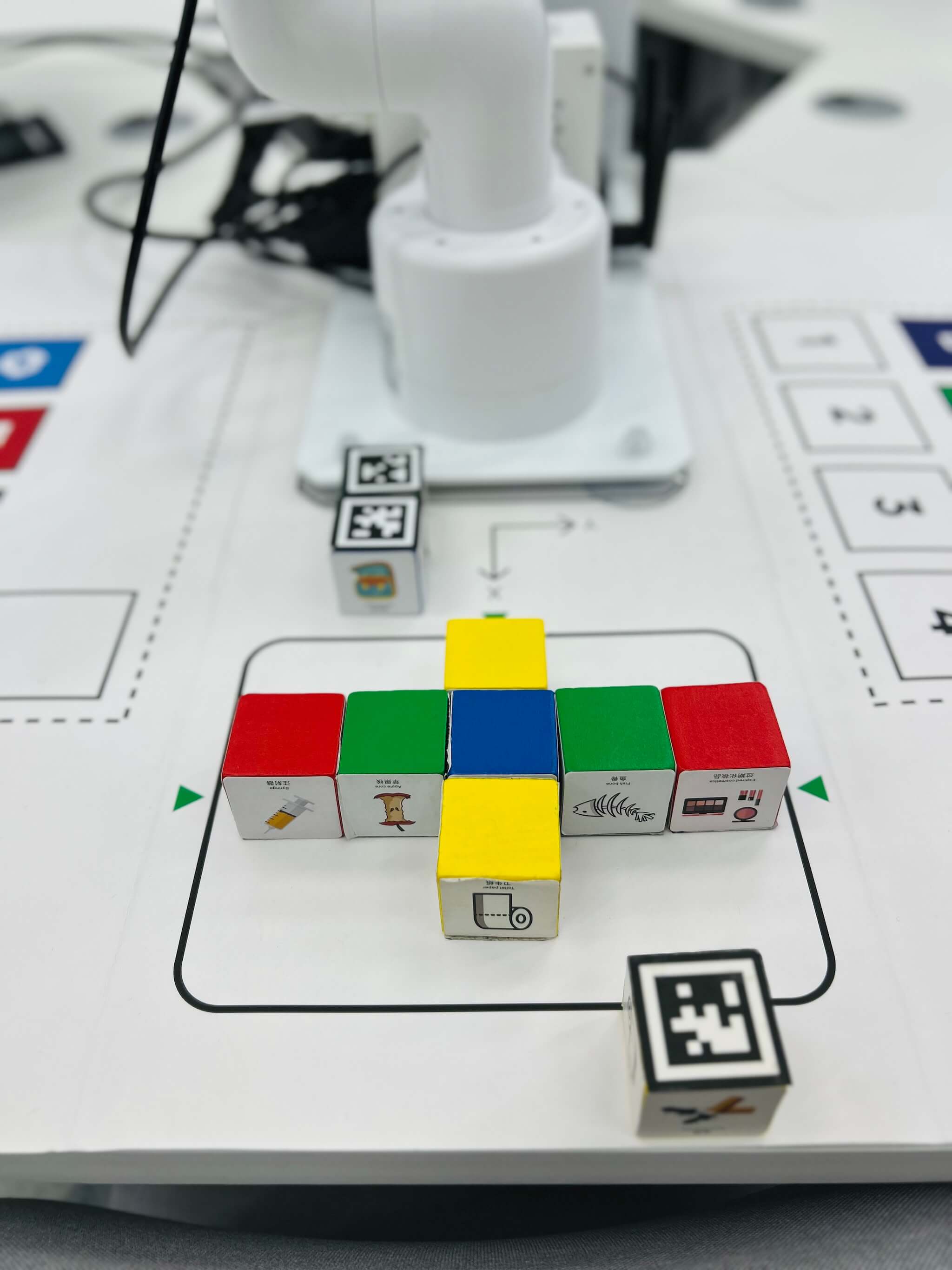 先在机械臂前面的桌面上放置待抓取的积木。✅ 图案面朝上。